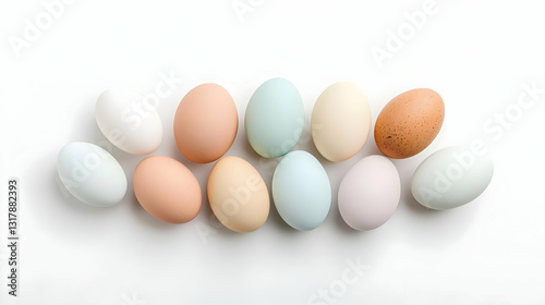 Ten Colorful Pastel Chicken Eggs Arranged In A Row On A Bright White Background Viewed From Above