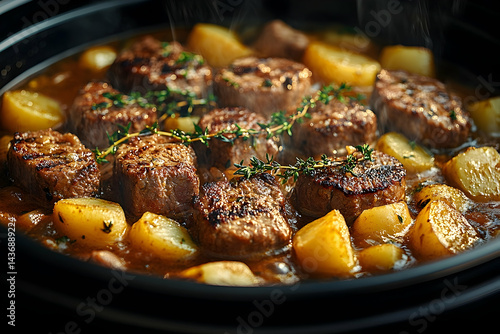 Tender beef stew with potatoes and herbs simmering in a black slow cooker, creating a warm atmosphere