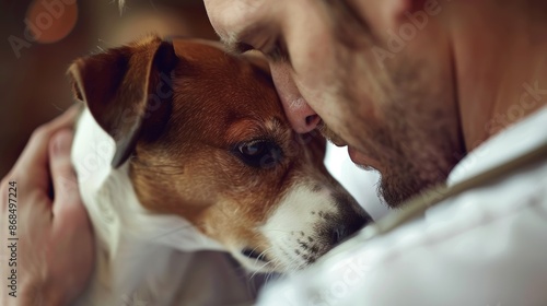 Tender moment between a man and his Jack Russell Terrier, showcasing their deep bond. Concept of love and companionship.