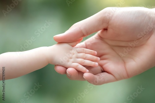 Tender moment of a baby's hand held by an adult's hand, symbolizing trust and care against a blurred natural background.