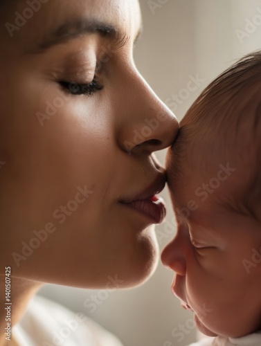 Tender mother kissing newborn baby, intimate family portrait, maternity magazine, parenting book, early childhood care, family love, healthcare blog, motherhood moments