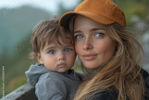 Tender Portrait of a Young Mother and Her Toddler Son: A Close-Up Image Showcasing Intimate Maternal Bond, Love, and Protection, Capturing a Moment of Peaceful Connection Between a Woman in Her