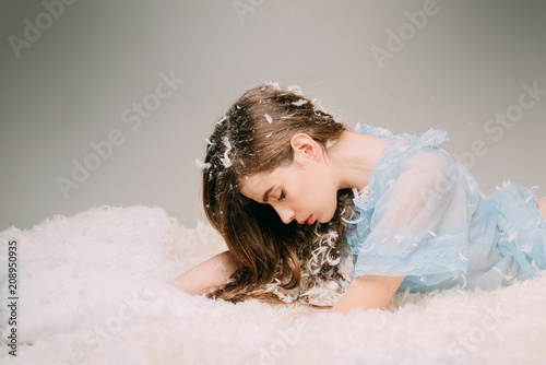 Tenderness and fragility of youth concept. Side view teenage girl lying on drowsy bed on gray background. Beautiful young fairy in blue dress with delicate features on soft cloud of white feathers