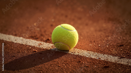 Tennis Ball on Clay Court: A vibrant yellow tennis ball sits directly on the line of a clay court, bathed in the sunlight, symbolizing precision and anticipation in a game of tennis.