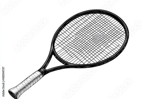 Tennis racket. A black tennis racket, with a silver-grey grip, is depicted in a 3/4 view. The strings and frame are clearly detailed