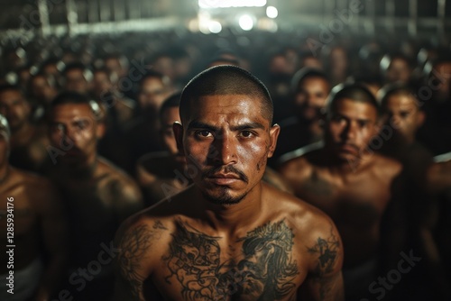 Tense atmosphere in a crowded facility with men in a challenging environment during daylight hours