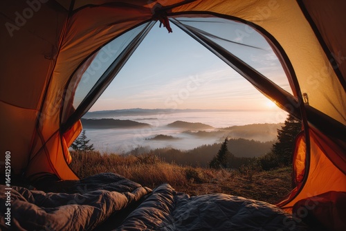 Tent camping view of landscape sunrise, fog in hills, nature adventure vacation