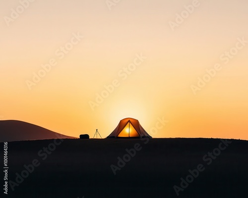 Tent on a mountain plateau, sunrise casting shadows, calm and inspiring
