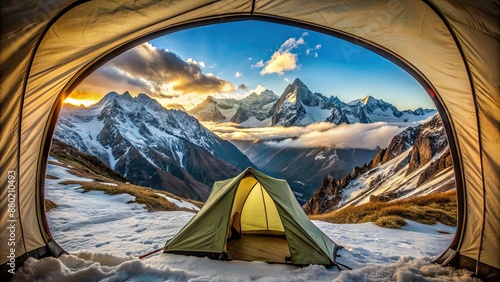 Tent overlooking snow-capped peaks and wilderness , contemplative, camping, tent, wilderness, snowy peaks, adventure
