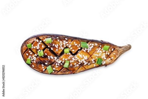 Teriyaki sesame seed baked eggplant on a white isolated background