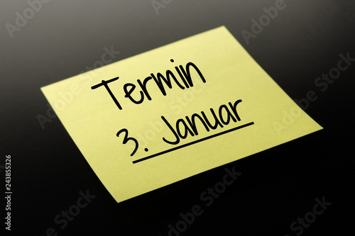 Termin 3. Januar - gelber Notizzettel dunkler Hintergrund