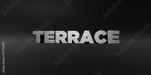TERRACE - hammered metal finish text on black studio - 3D rendered royalty free stock photo. This image can be used for an online website banner ad or a print postcard.