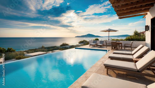Terrace of a resort hotel with sunbeds and swimming pool with clear blue water with breathtaking panoramic sea view