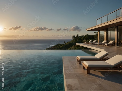 Terrace with infinity pool and ocean view, offering high-end coastal living and relaxation.