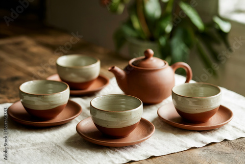 Terracotta Teapot and Ceramic Cups on Linen Cloth tea set tea cups