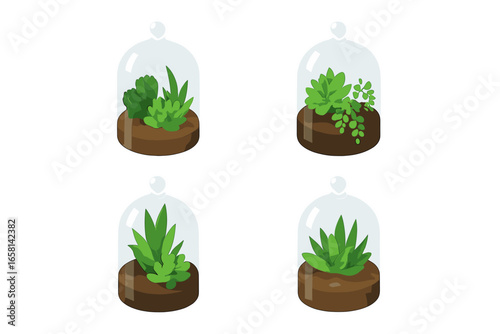Terrarium icons collection. Isometric flat icon set of plants in glass containers. Succulent in closed glass dome. Mini garden houseplant. Botany vector graphic element.