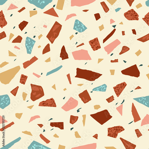 Terrazzo floor marble seamless hand crafted pattern. Traditional venetian material.Granite and quartz rocks and sprinkles mixed on polished surface.Abstract vector background for architecture designs