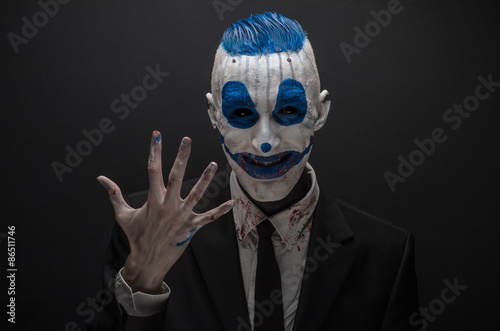 Terrible clown and Halloween theme: Crazy blue clown in black suit isolated on a dark background in the studio