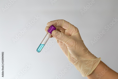Test tube with blue transparent chemical fluid in the hands of a scientist. Hands in latex gloves. Vacuum test tube.