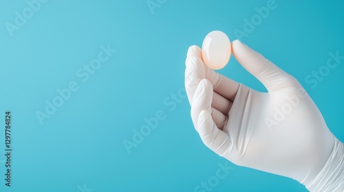 Testicular Replacement Prosthesis Held by Gloved Hand on Blue Background