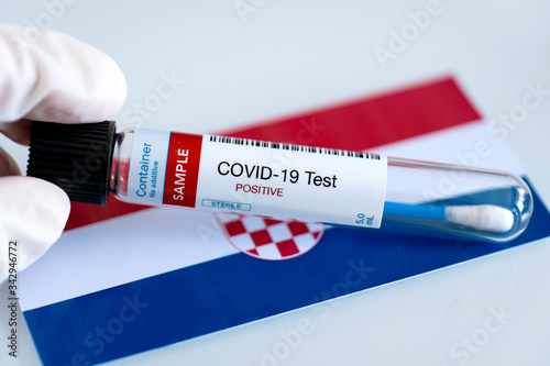 Testing for presence of coronavirus in Croatia. Tube containing a swab sample that has tested positive for COVID-19. Croatian flag in the background.