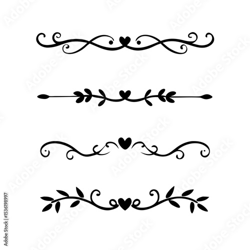 Text dividers with hearts doodle set. Wedding decorative elements. Divider ornament, borders, lines. Hand drawn vector illustration isolated on white background