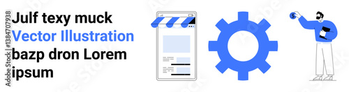 Text elements beside webpage interface, gear icon symbolizing functionality, and user with a device. Ideal for technology, innovation, UX design, digital tools, online services, app development