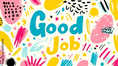 text "Good Job" in whimsical, handwritten, rounded font with irregular letter , playful patterns, like polka dots, stripes, or doodles