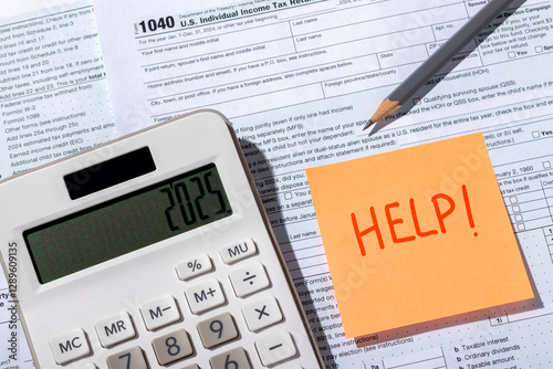 Text Help on orange sticker on individual income tax return form 1040 and white calculator close-up