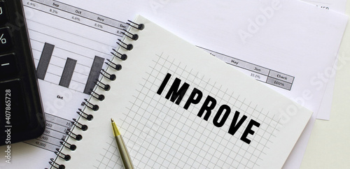 Text IMPROVE on the page of a notepad lying on financial charts on the office desk.