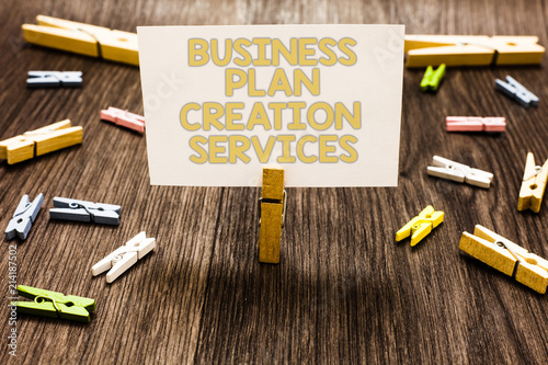 Text sign showing Business Plan Creation Services. Conceptual photo paying for professional to create strategy Clothespin holding white paper note several clothespins wooden floor.