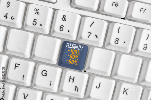 Text sign showing Flexibility 100 Percent 90 Percent 80 Percent. Business photo showcasing How much flexible you are maleability level White pc keyboard with empty note paper above white background