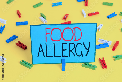 Text sign showing Food Allergy. Business photo showcasing an abnormal immune response after eating a certain food Colored clothespin papers empty reminder yellow floor background office