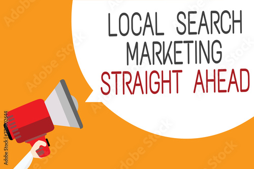 Text sign showing Local Search Marketing Straight Ahead. Conceptual photo answering to someone about destination Man holding megaphone loudspeaker speech bubble message orange background
