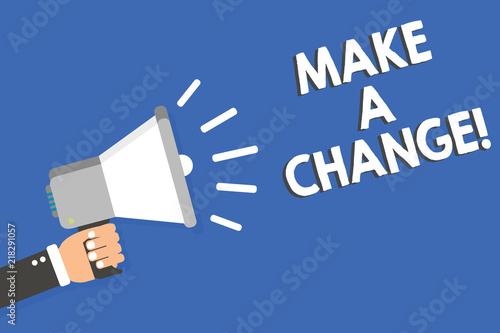 Text sign showing Make A Change. Conceptual photo Try new thing Evolve Evolution Improvement Growth Mature Man holding megaphone loudspeaker blue background message speaking loud.