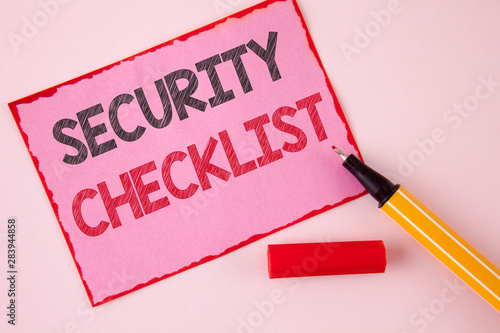 Text sign showing Security Checklist. Conceptual photo list with authorized names to enter allowing procedures written Pink Sticky Note paper the plain background Pen next to it.