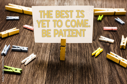 Text sign showing The Best Is Yet To Come. Be Patient. Conceptual photo dont lose hope light come after darkness Clothespin holding white paper note several clothespins wooden floor