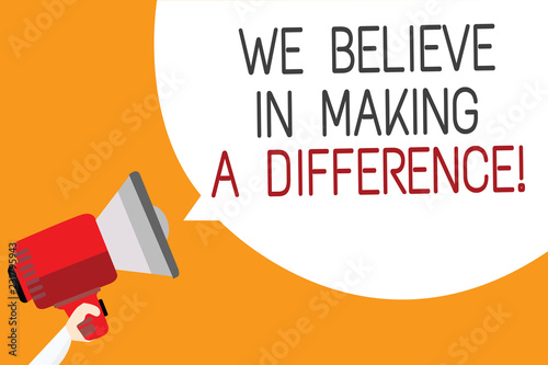 Text sign showing We Believe In Making A Difference. Conceptual photo self-confidence that can be unique Man holding megaphone loudspeaker speech bubble message orange background
