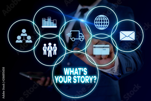 Text sign showing What S Your Story Question. Business photo showcasing asking demonstrating about his past life actions career or events Male human wear formal work suit presenting presentation using