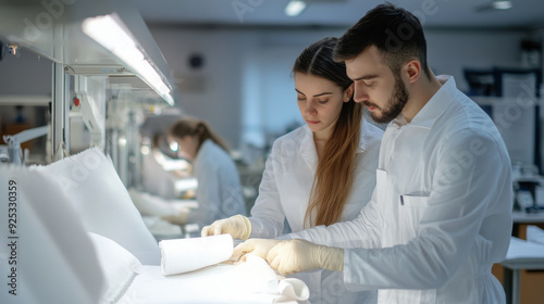 Textile quality assurance team examining fabric samples under bright, precise lighting