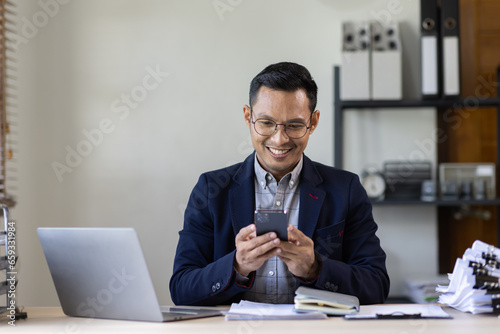 Texting to colleague or play games. Confident young asian man in smart casual wear holding smart phone and looking at it while sitting at his working place in office