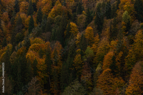 Texture background of autumn forest in mountains. Fall colored natural view.