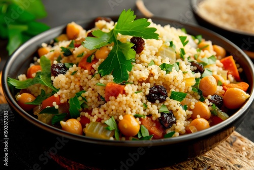 texture Fluffy Couscous vegetable stew chickpeas raisins North African serving dish communal style meal desert oasis setting warm inviting light close up grain