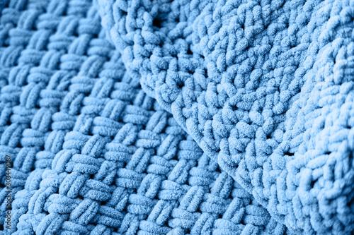 Texture of blue knit blanket. Plaid merino wool.