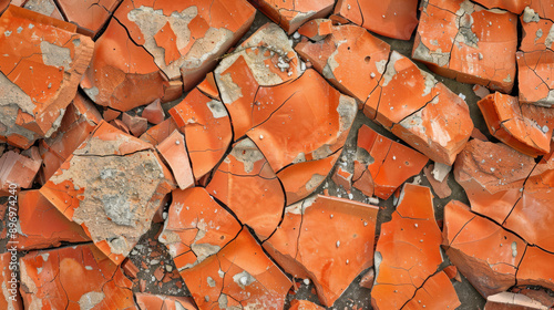Texture of old broken red brick on the ground for background. Broken red brick for design.