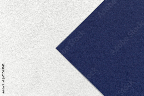 Texture of paper white background, half two colors with navy blue arrow, macro. Structure of dense craft cardboard
