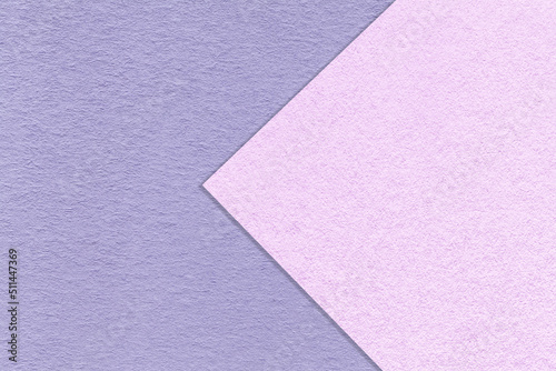 Texture of purple and lilac paper background, half two colors with arrow, macro. Structure of craft violet cardboard.