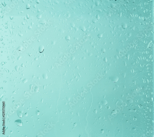 Texture of water drops on a glass window. Pastel water green or blue green background, with a color gradient. Raindrop and droplets on transparent surface.