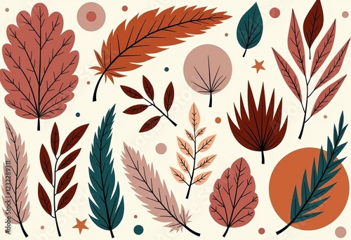Textured Bohemian Design: Terracotta, Rose, Ivory, Turquoise, Organic Shapes, Hand-drawn Feathers, Geometric Details, Abstract Floral Art, Relaxed Layout, Eclectic Style, Nature Feel.
