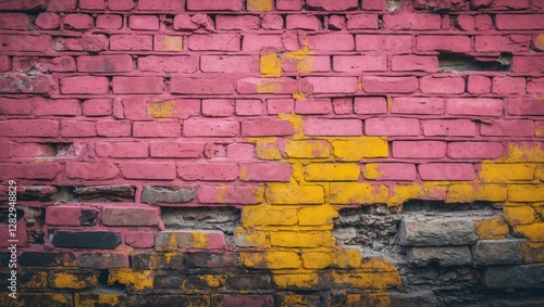 Textured brick wall with faded pink and yellow paint, showing signs of wear and age, urban background detail.
